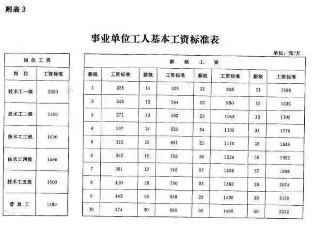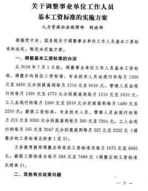 从2018年7月1日起调整事业单位工作人员基本工资标准,调整后的岗位工资标准专业技术人员由现行的每月1390元至4850元分别提高到每月1510元至6010元,管理人员由现行的每月1390元至4770元分别提高到每月1510元至5910元,工人由现行的每月1360元至2010元分别提高到每月1480元至2250元。