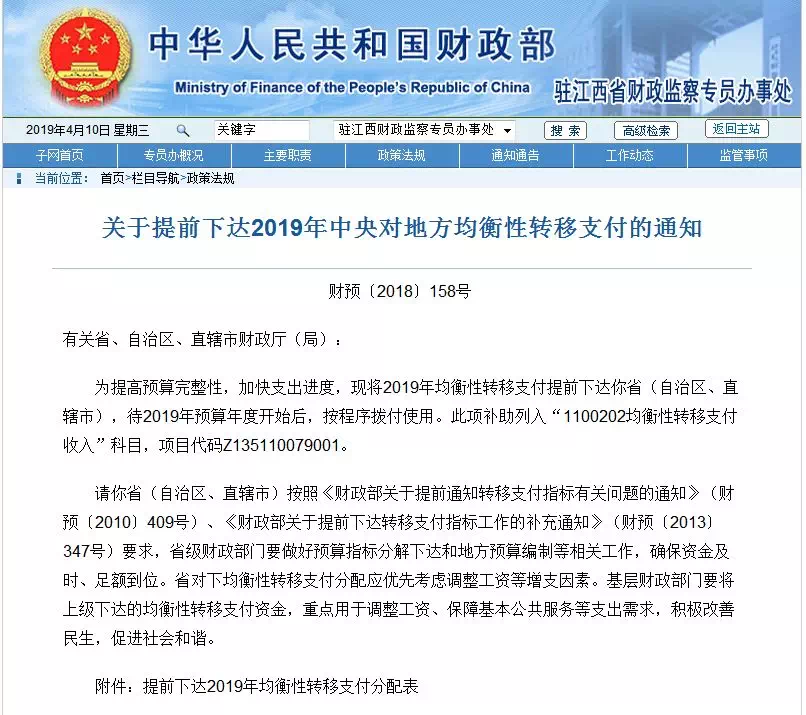 2018年底国家财政部发布了一条通知《关于提前下达2019年中央对地方均衡性转移支付的通知》,在该通知中,明确指出应优先考虑调整工资等增支因素,2019年均衡性转移支付13350.2亿元资金分配给内蒙古、山西、四川湖南、广西、山东等26个省份。