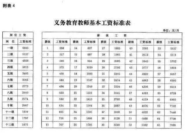义务教育教师调整后的岗位工资标准为每月1675元至6665元,薪级工资标准为每月288元至7989元。