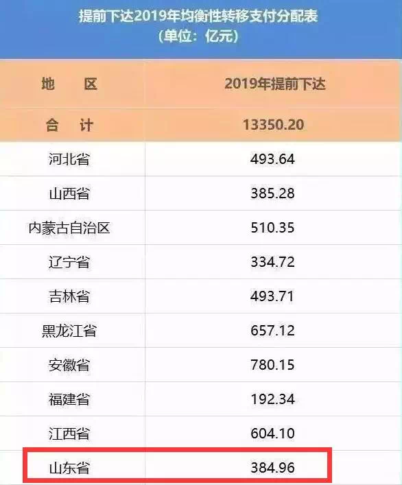 通知中提到省对下均衡性转移支付分配应优先考虑调整工资等增支因素,基层财政部门要将上级下达的均衡性转移支付资金重点用于调整工资、保障基本公共服务等支出需求积极改善民生,促进社会和谐。其中山东分到384.96亿元。