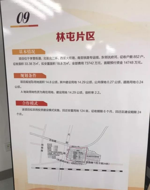 该片区将征收852户,征收面积33.38万㎡,拟安置面积18.8万㎡,全部费用73742万元,首期预付资金14748万元。该项目拟采用投资建设模式实施,回迁安置用地124亩,征收期限6个月,回迁区建设期限24个月。