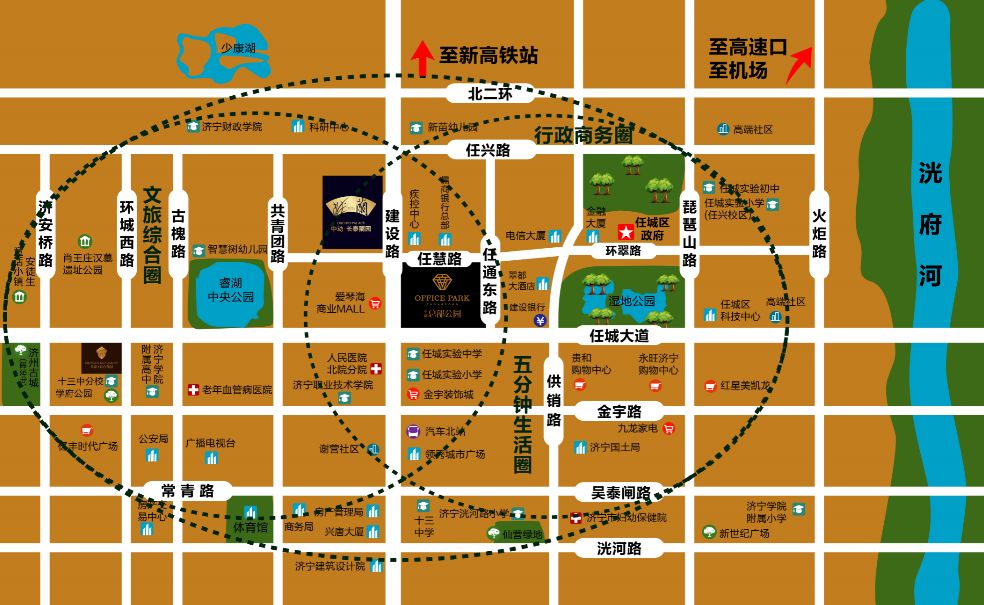 周边政府机构、湿地公园环河绿化带环伺,