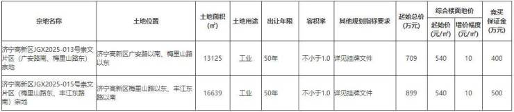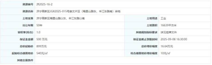 土地位于:济宁高新区梅里山路以东、丰江东路以南;土地面积:16639㎡(约25亩);土地用途:工业用地;出让年限:50年;容积率不小于1.0;起始价:899万元,综合楼面价起价:540元/㎡;最终成交价为:899万元(约36万元/亩),综合楼面地价成交价:540元/㎡;溢价率:0.0%;