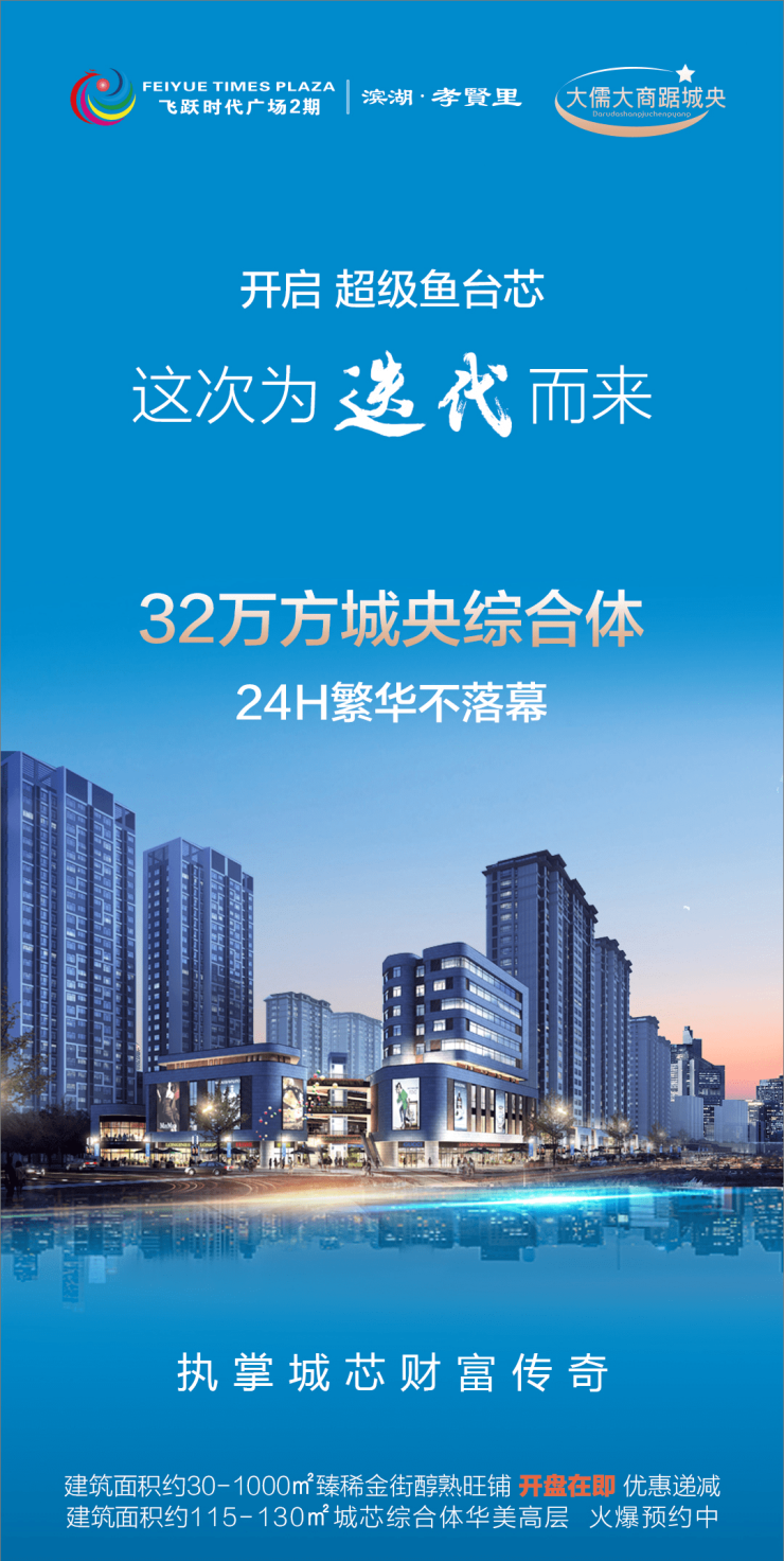 飞跃时代广场2期-滨湖·孝贤里,集合吃喝玩乐购娱闲多元化品牌体验,涵盖城市级全客层大商业、24h体验式潮流街区等丰富业态,填补城市高端体验式商业少有,为鱼台缔造崭新封面作品。