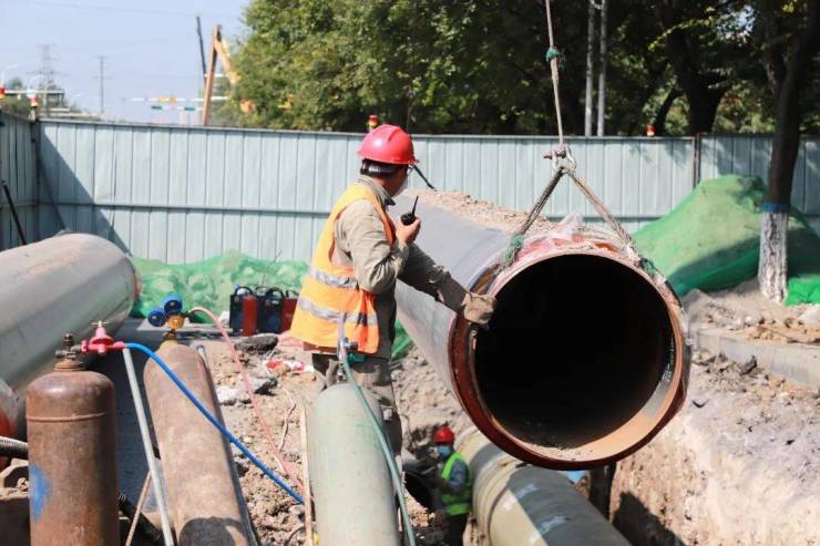 在施工现场,吊车正将吊起的回水管垂直放入管沟中。据了解,该工程总长2.5公里,总投资2200万元。管网贯通后,能实现高新大道和开源路高温水管网互联互通,为接庄片区附近在建小区及项目的居民提供供暖保障。建设单位严格按照工期要求,持续加强人员管理,确保各项施工安全、平稳、有序开展。
