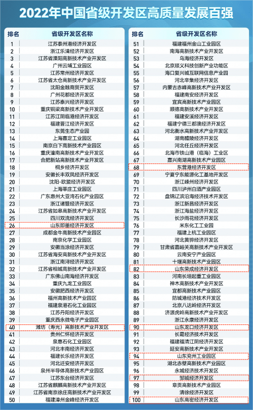 近日,《中国省级开发区高质量发展报告2022》发布,报告揭晓了“2022年中国省级开发区高质量发展百强榜单”,山东8个园区入选(其中济宁2个园区入选 ),分别是:即墨经济开发区、潍坊(寿光)高新技术产业开发区、东营港经济开发区、荣成经济开发区、龙口经济开发区、 兖州工业园区、邹城经济开发区 、高密经济开发区。