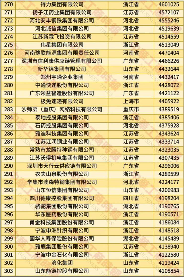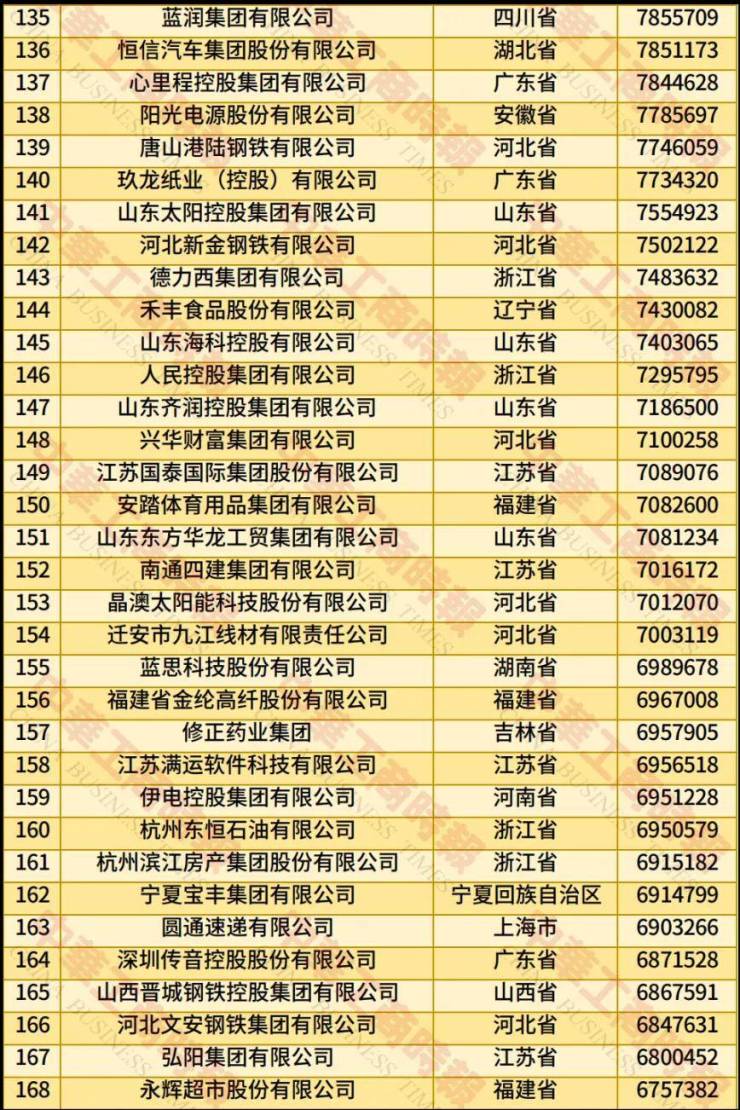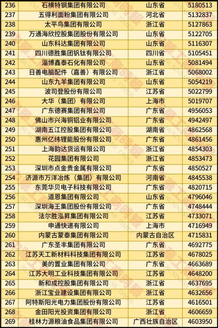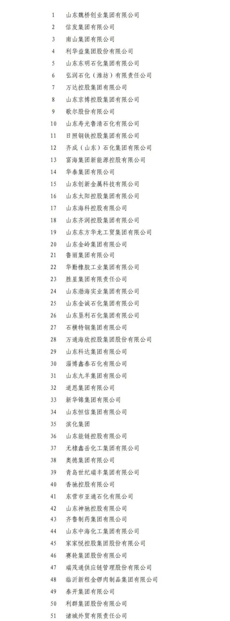 今年,山东共有51家企业入选,分别是:山东魏桥创业集团、信发集团、南山集团、利华益集团、东明石化、弘润石化、万达控股、京博控股、歌尔股份、鲁清石化、日照钢铁、齐成石化、富海集团、华泰集团、山东创新金属、太阳控股、海科控股、齐润控股、东方华龙、金岭集团、鲁丽集团、华勤橡胶、胜星集团、渤海实业、金诚石化、垦利石化、石横特钢、万通海欣、科达集团、鑫泰石化、九羊集团、道恩集团、新华锦集团、恒信集团、滨化集团、能链控股、鑫岳化工、奥德集团、世纪瑞丰集团、香驰控股、亚通石化、神驰控股、齐鲁制药、中海化工、家家悦集团、赛轮集团、瑞茂通、金锣集团、泰开集团、利群集团、诸城外贸。2024年,山东共有50家企业入选中国民营企业500强。其中,太阳控股、华勤橡胶、恒信集团3家济宁企业入选。