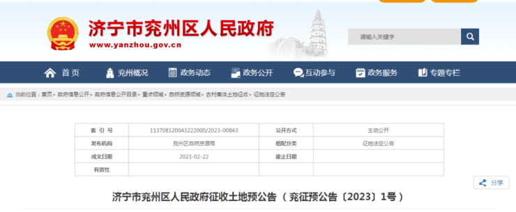 近日,兖州区人民政府发布了济宁市兖州区人民政府征收土地预公告 (兖征预公告〔2023〕1号),涉及11处土地,具体如下: