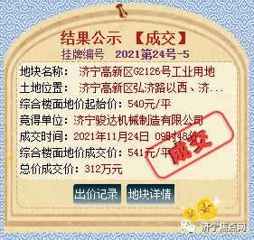 土地位于:济宁高新区弘济路以西、济宁骏达机械制造有限公司以东;土地面积:5762㎡(约8.6亩);土地用途:工业用地;出让年限:50年;容积率不小于1.0;起始价:312万元,综合楼面价起价:540元/㎡;交付条件为净地(执行标准化供应);最终成交价为:312万元(约36万元/亩),综合楼面地价成交价:540元/㎡;溢价率:0.0%;