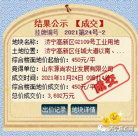 土地位于:济宁高新区任城大道以南、山东源尚农业发展公司以东;土地面积:68368㎡(约103亩);土地用途:工业用地;出让年限:50年;容积率不小于1.2;起始价:3692万元,综合楼面价起价:450元/㎡;交付条件为净地(执行标准化供应);最终成交价为:3692万元(约36万元/亩),综合楼面地价成交价:450元/㎡;溢价率:0.0%;