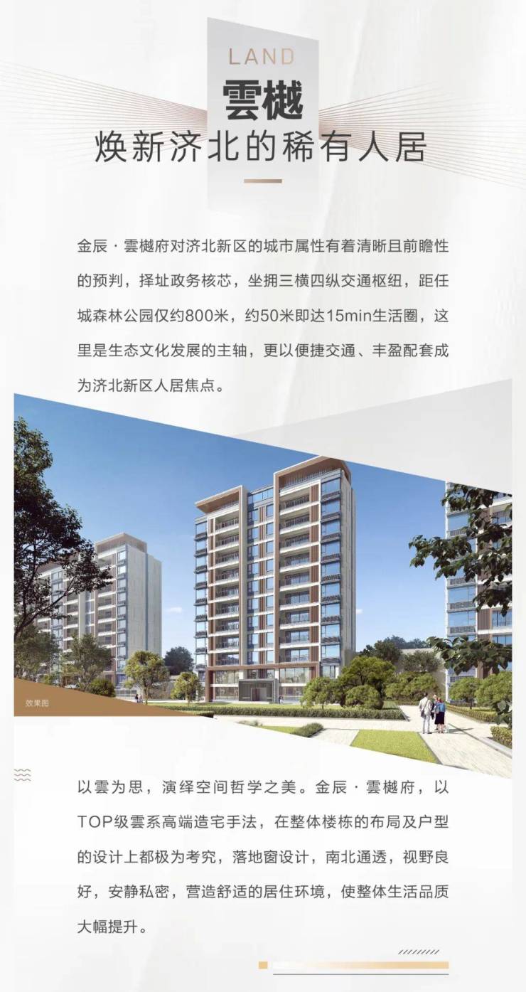 金辰·雲樾府对济北新区的城市属性有着清晰且前瞻性的预判,择址政务核芯,坐拥三横四纵交通枢纽,距任城森林公园仅约800米,约50米即达15min生活圈,这里是生态文化发展的主轴,更以便捷交通、丰盈配套成为济北新区人居焦点。