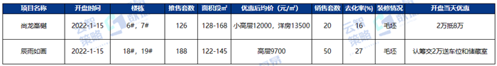 第2周市场共2个项目开盘加推,其中尚龙峯樾首开洋房6#,小高层7#,共计推售126套,去化率16%;辰雨如画首开高层18#,19#,共计推售188套,去化率27%。