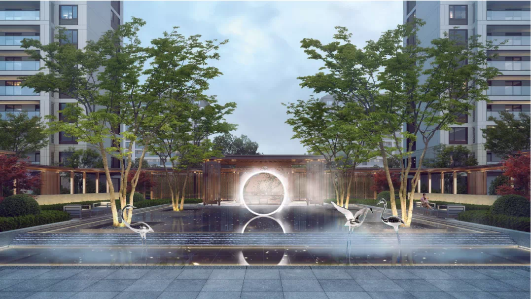 鹤在中国文化中有崇高的地位,是长寿、吉祥、高雅、尊贵的象征。诗仙李白曾在《金乡薛少府厅画鹤赞》中赞道:“图蓬山之奇禽,想瀛海之瞟眇。紫顶烟赩,丹眸星皎。昂昂欲飞一作贮贻,霍若惊矫。” 因此在造园时选用“鹤”为设计主题,造就一处尊贵典雅的居住苑府,实现传统与现代的碰撞,打造区域独有的新中式景观风格。