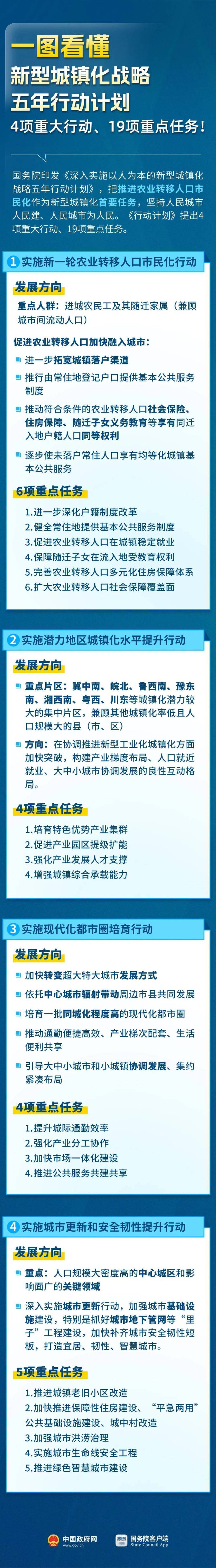 国务院日前印发《深入实施以人为本的新型城镇化战略五年行动计划》,《行动计划》提出4项重大行动、19项重点任务及有关政策措施。一文读懂!