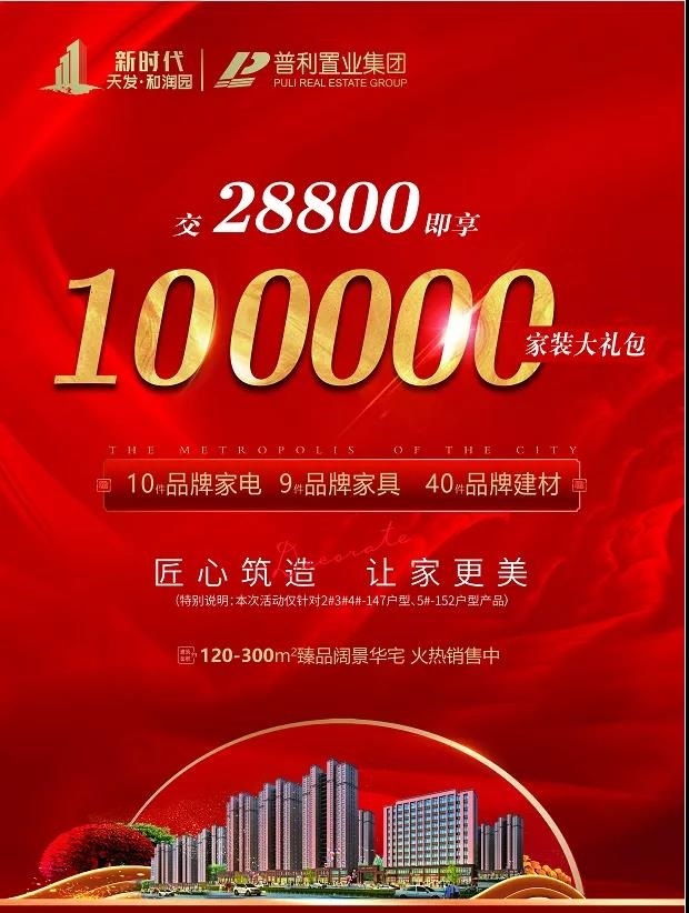 为了感谢大家持续以来对新时代 天发·和润园的支持,项目精装推广季活动随着活动样板间的开放也正式推出啦,交28800元即享100000元家装大礼包。