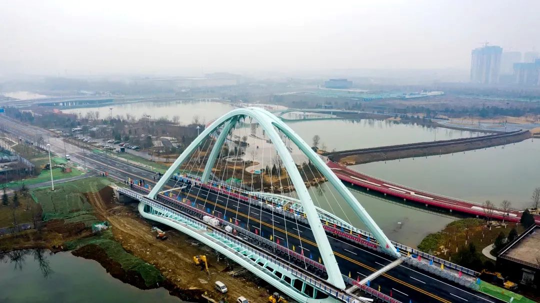 2021年完成了高新大道嘉达路至群英路段升级改造、鸿广路桥等7座桥梁建设,此次通车的鸿广路桥是高新区重点打造的桥梁工程,项目位于蓼河汇入鸿雁湖河口处,跨越蓼河,连接东、西两岸,总长131m,桥梁标准宽度33.5m,桥梁标准宽度33.5m,主桥为跨径97m的下承式钢箱系杆拱桥,两侧为跨径17m的简支组合梁引桥,主拱拱轴线高耸,配合扇形拉索面,副拱悬出主桥面向湖面倾斜,与主桥面之间以阵列的桁架构件相接。项目的建成,标志着鸿广路东、西段全面打通,将极大缓解孟子大道、山博路等东西向道路的交通压力,有助于进一步完善蓼河新城路网结构,改善周边群众的出行环境,带动周边相关产业发展,为蓼河新城高质量发展注入新的活力。