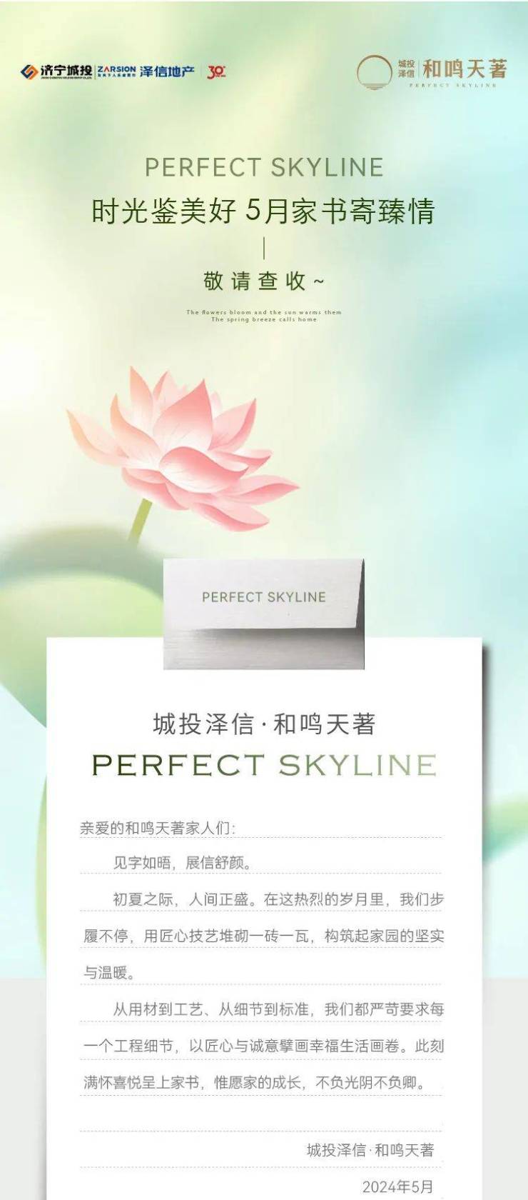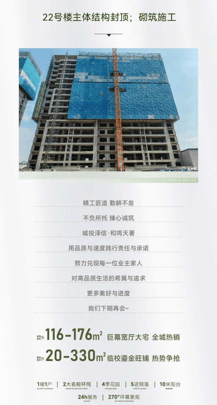 初夏之际,人间正盛。在这热烈的岁月里,城投泽信·和鸣天著步履不停,用匠心技艺堆砌一砖一瓦,构筑起家园的坚实与温暖。从用材到工艺、从细节到标准,我们都严苛要求每一个工程细节,以匠心与诚意擘画幸福生活画卷。此刻满怀喜悦呈上家书,惟愿家的成长,不
