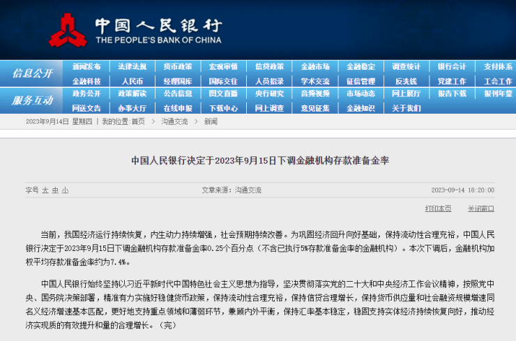 据中国人民银行官网最新消息,当前,我国经济运行持续恢复,内生动力持续增强,社会预期持续改善。为巩固经济回升向好基础,保持流动性合理充裕,中国人民银行决定于2023年9月15日下调金融机构存款准备金率0.25个百分点(不含已执行5%存款准备金率的金融机构)。本次下调后,金融机构加权平均存款准备金率约为7.4%。
