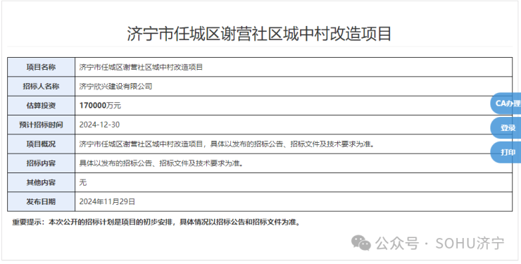 11月29日,济宁市任城区公共资源交易网发布了,济宁市任城区谢营社区城中村改造项目招标计划。该项目招标人为济宁欣兴建设有限公司,估算投资170000万元。