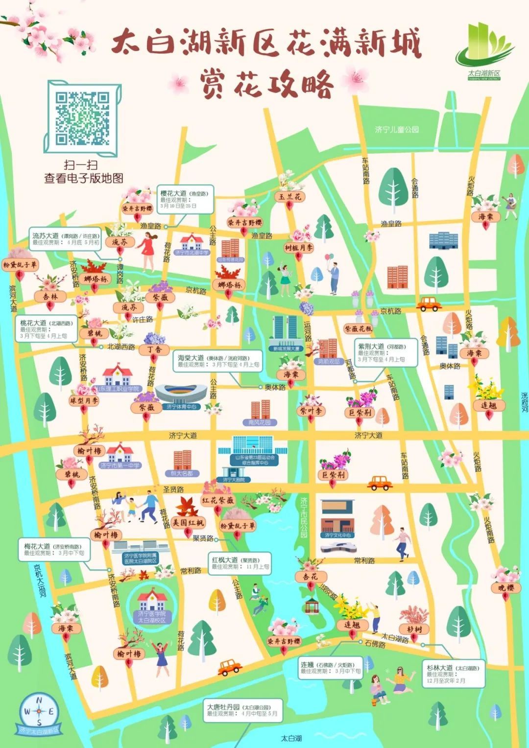 2018年以来,太白湖新区园林服务中心邀请国内知名专家和设计公司,对该区城市园林绿化品质提升进行统一规划设计,高标准编制《太白湖新区城市立体绿化实施方案》和《太白湖新区城市绿化花满新城三年建设计划实施方案》,因地制宜开展艺术性、个性化打造。其中,火炬路补植榉树2200余棵;京杭路补植纳塔栎、大叶朴树2700余棵形成了林荫型道景观道;运河路补植月季、流苏3300余棵,玉兰、月季、流苏次第竞相绽放;济安桥路种植榆叶梅、红梅等梅花,形成了以梅花为主的梅花大道;渔皇路种植染井吉野樱花5000余株,打造成了樱花烂漫大道;河都路种植巨紫荆、紫荆、紫藤1800余株,形成紫色大道,寓意人民的生活幸福安康;谭岗路、许庄路西段种植流苏1900余株,春天来临,圣洁的流苏花挂满枝头,让人流连忘返;诗圣路、农场路种植金叶槭600余株,形成了金色大道。为丰富园林景观,该区在奥体路、运河路、圣贤路、市民公园建设了16处花境,丰富了园林绿化的景观层次。
