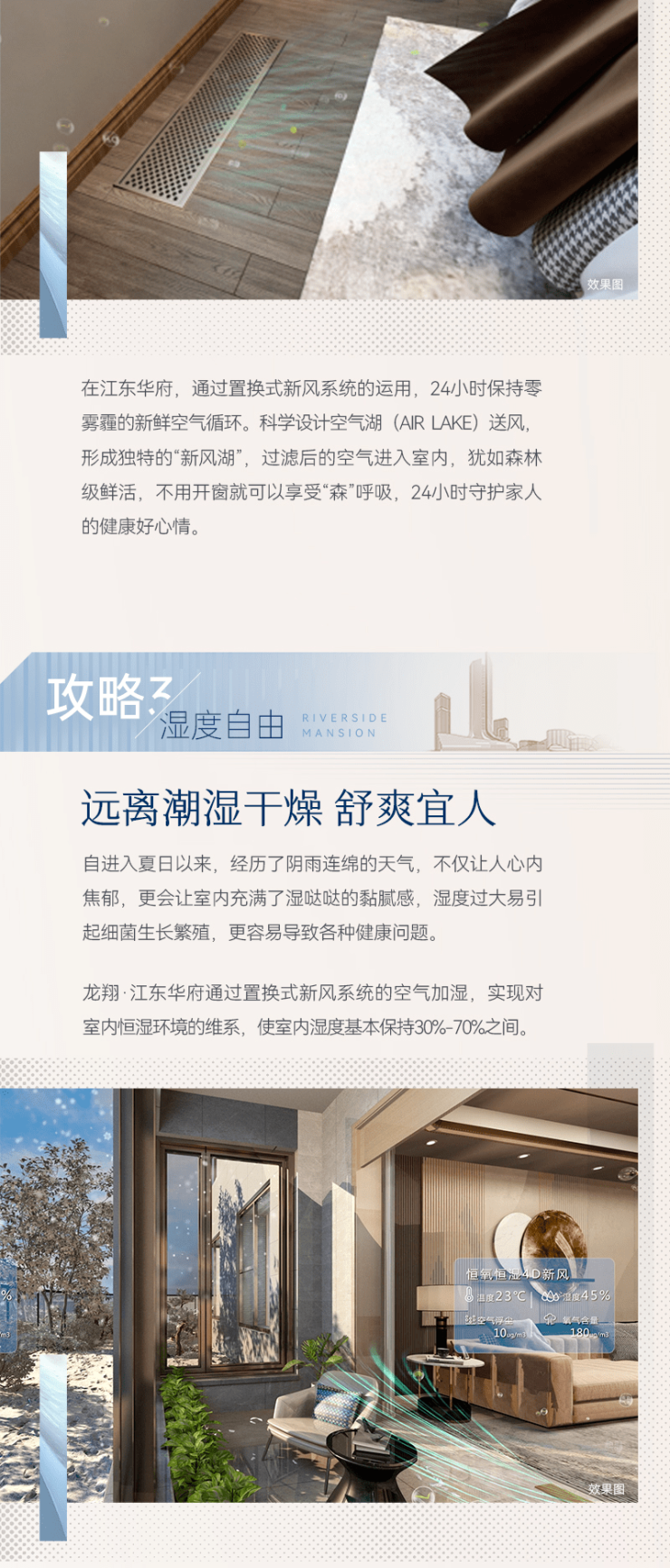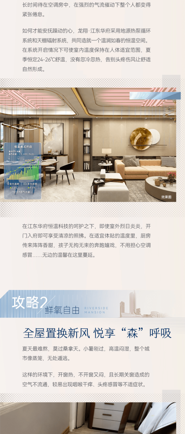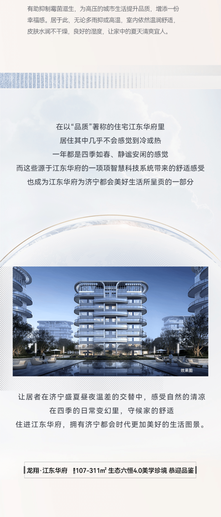 在以“品质”著称的住宅龙翔·江东华府里,居住其中几乎不会感到冷或热。一年都是四季如春、静谧安闲的感觉,而这些源于龙翔·江东华府的一项项智慧科技系统带来的舒适感受,也成为龙翔·江东华府为济宁都会美好生活所呈贡的一部分。