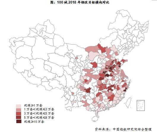 省级棚改完成情况及目标的变化也将使各城市产生相应变化,而这一变化也将通过棚改特别是棚改货币化传导至住房市场。我们选取了具有代表性的100个三四线城市,通过梳理这些城市近年棚改完成规模及2018年棚改目标,对这些城市未来棚改规模进行横向纵向对比,分类探讨城市未来棚改空间。