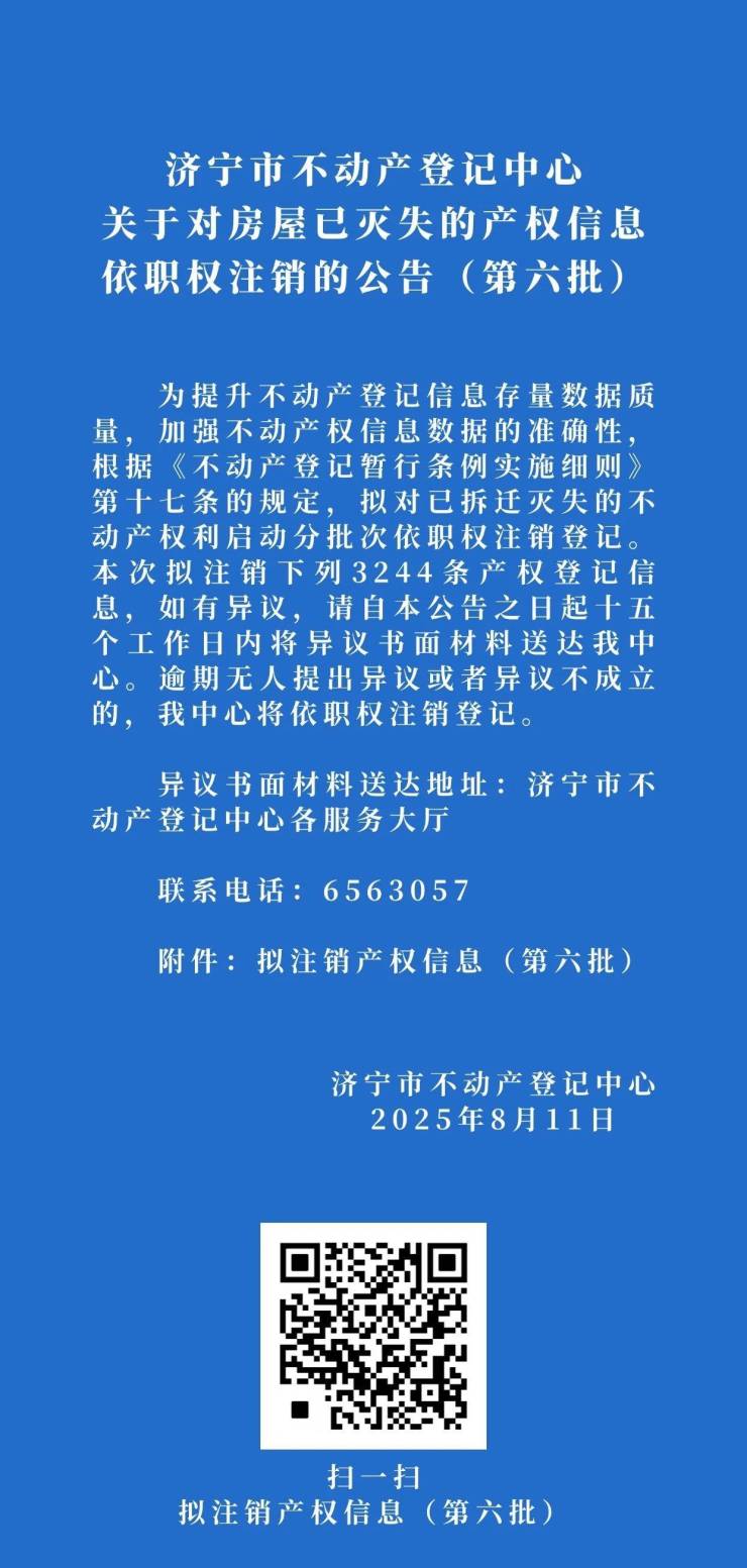 为提升不动产登记信息存量数据质量,加强不动产权信息数据的准确性,根据《不动产登记暂行条例实施细则》第十七条的规定,拟对已拆迁灭失的不动产权利启动分批次依职权注销登记。本次拟注销下列3244条产权登记信息,如有异议,请自本公告之日起十五个工作日内