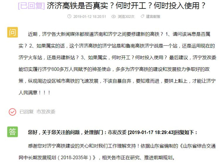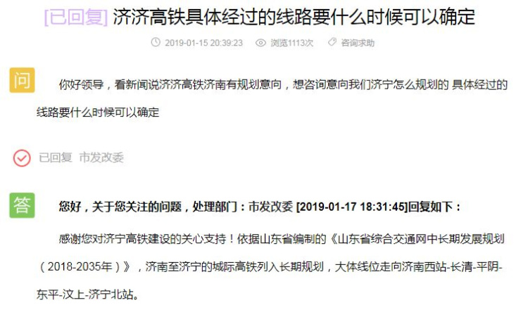 网友问:你好领导,看新闻说济济高铁济南有规划意向,想咨询意向我们济宁怎么规划的 具体经过的线路要什么时候可以确定?