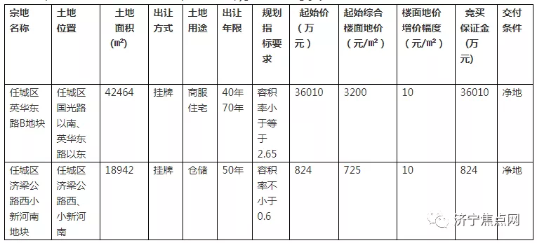土地位于:任城区济梁公路西、小新河南;土地面积:18942㎡(约28亩);土地用途:仓储用地;出让年限:50年;容积率不小于0.6;起始价:824万元,综合楼面价起价:725元/㎡;交付条件为净地;最终成交价为:824万元(约29.5万元/亩),综合楼面地价成交价:725元/㎡;