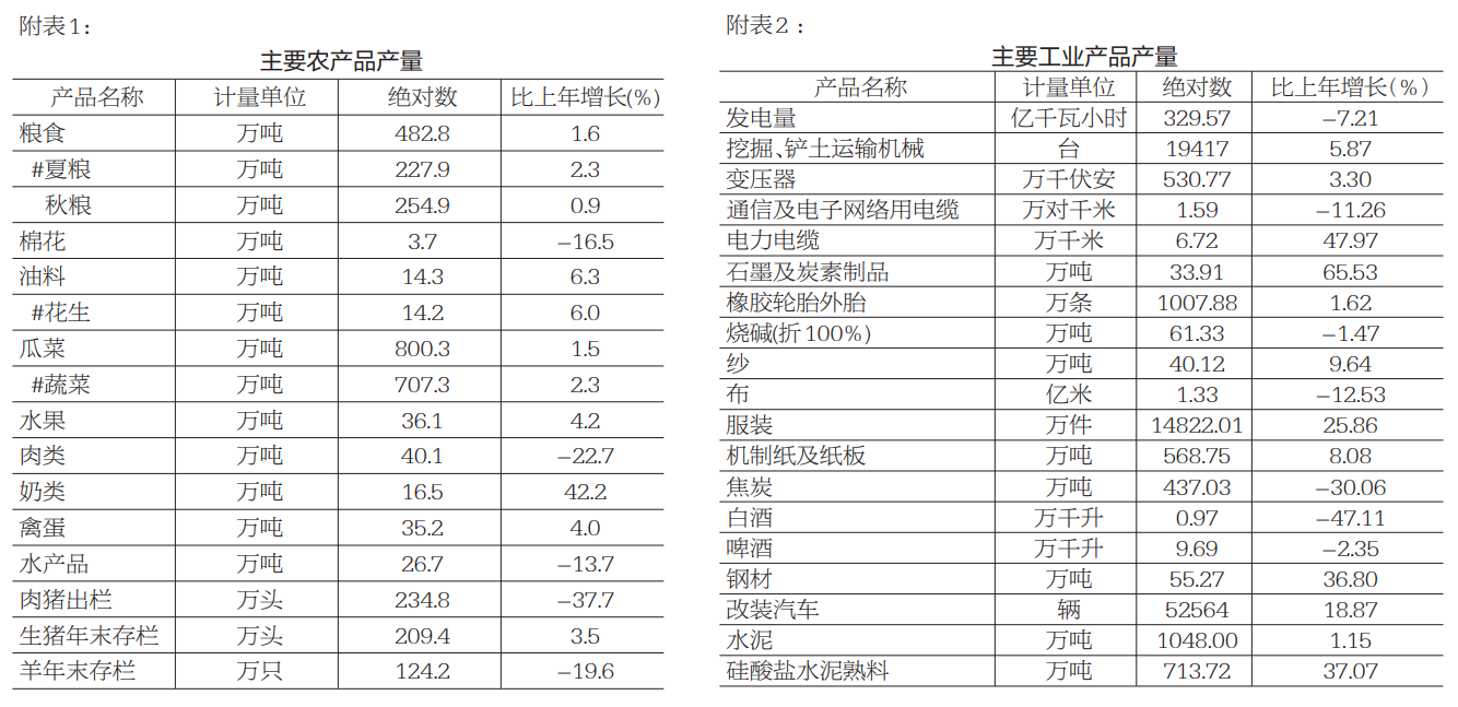 主要农副产品产量保持稳定。全年粮食作物播种面积1075.5万亩、与上年持平略增;粮食产量482.8万吨、增长1.6%。单产448.9公斤、增长1.6%。其中夏粮227.9万吨、增长2.3%;秋粮254.9万吨、增长0.9%。经济作物面积380.2万亩、减少1.5万亩,蔬菜瓜果面积279.1万亩、增加5.8万亩,棉花产量3.7万吨、下降16.5%,油料产量14.3万吨、增长6.3%。园林水果产量36.1万吨、增长4.2%。肉类总产量40.1万吨、下降22.7%,禽蛋总产量35.2万吨、增长4.0%,奶类总产量16.5万吨、增长42.2%,水产品总产量26.7万吨、下降13.7%。