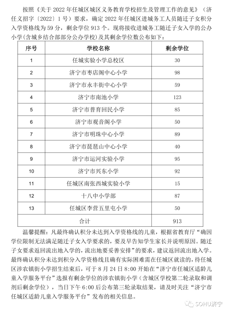 913个!2022年任城区积分入学资格线及剩余学位数公布
