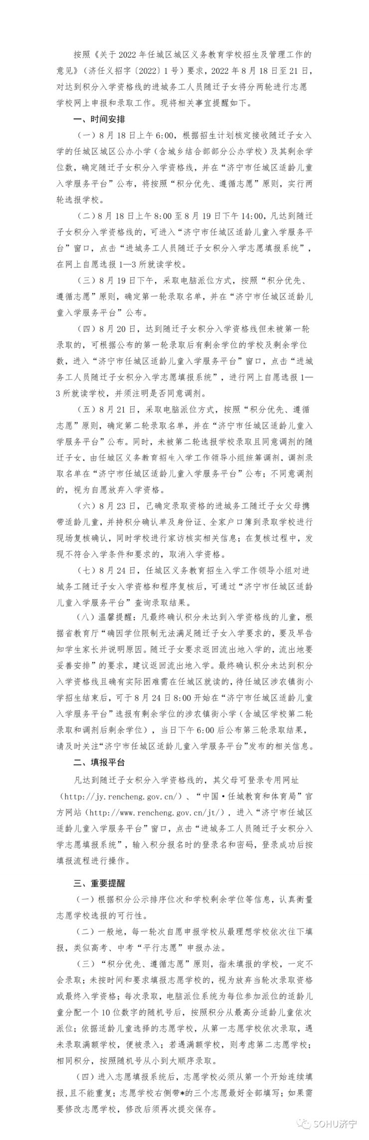 2022年任城区进城务工人员随迁子女积分入学志愿学校申报和录取须知,2022年任城区进城务工人员随迁子女积分入学资格线及城区公办小学剩余学位数公布