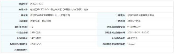 土地位于:任城区金城街道常青路以北、山矿路以东;土地面积:34648㎡(约52亩);土地用途:城镇住宅用地兼容商业用地;出让年限:住宅70年、商业40年;容积率不大于1.5;起始价:15124万元,综合楼面价起价:2910元/㎡;最终成交价为:15124万元(约291万元/亩),综合楼面地价成交价:2910元/㎡;溢价率:0.0%;