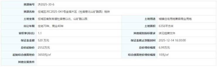 土地位于:任城区南张街道杜庙巷以北、山矿路以西;土地面积:6356㎡(约9.5亩);土地用途:城镇住宅用地兼容商业用地;出让年限:住宅70年、商业40年;容积率不大于1.1;起始价:2552万元,综合楼面价起价:3650元/㎡;最终成交价为:2552万元(约269万元/亩),综合楼面地价成交价:3650元/㎡;溢价率:0.0%;