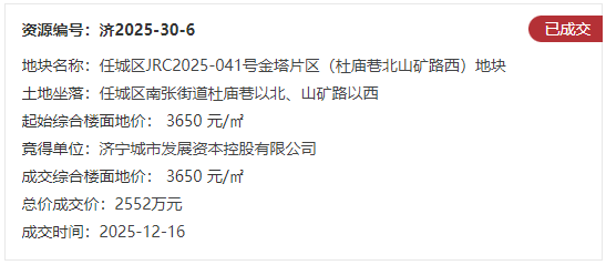地块六:任城区JRC2025-041号金塔片区(杜庙巷北山矿路西)地块【济宁城市发展资本控股有限公司竞得】
