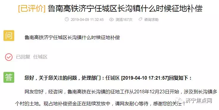 网友提问:鲁南高铁济宁任城区长沟镇什么时候征地补偿