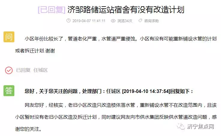任城区回复:网友您好,经核实,老旧小区改造只改造楼体落水管,重新铺设水管不在改造范围内,且该小区暂时没有老旧小区改造及拆迁计划,同时建议网友向市供水集团反映供水管道改造问题,感谢您的关注。