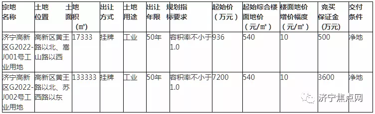 济宁城区年前挂地!搜狐网·搜狐焦点济宁小编从济宁市自然资源和规划局了解到:经济宁市人民政府批准,济宁市自然资源和规划局高新技术产业开发区分局决定以网上挂牌方式出让济宁高新区2宗集体经营性建设用地使用权,土地用途为工业用地;土地面积150666㎡,约226亩;土地起始价为8136万元;