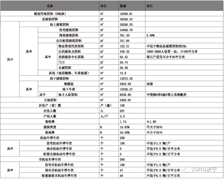 项目规划用地面积15050.81㎡(约22.6亩);总建筑面积:39530.43㎡;其中,地上建筑面积为26258.03㎡、地下建筑面积为13272.4㎡;容积率为1.74;建筑密度15.83%;绿地率35%;计划总居住户(套)数为196户(套),居住人数约627人(按3.2人/户预算);建筑类型包括住宅、商业、公共配套设施等;规划机动车停车位206个,非机动车位289个。