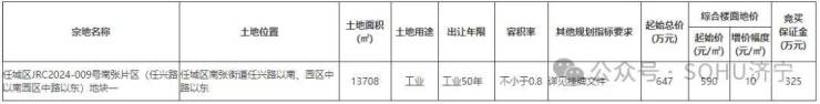 土地位于:任城区南张街道任兴路以南、园区中路以东;土地面积:13708㎡(约20.6亩);土地用途:工业用地;出让年限:50年;容积率不小于0.8;起始价:647万元,综合楼面价起价:590元/㎡;最终成交价为:647万元(约31万元/亩),综合楼面地价成交价:590元/㎡;溢价率:0.0%;