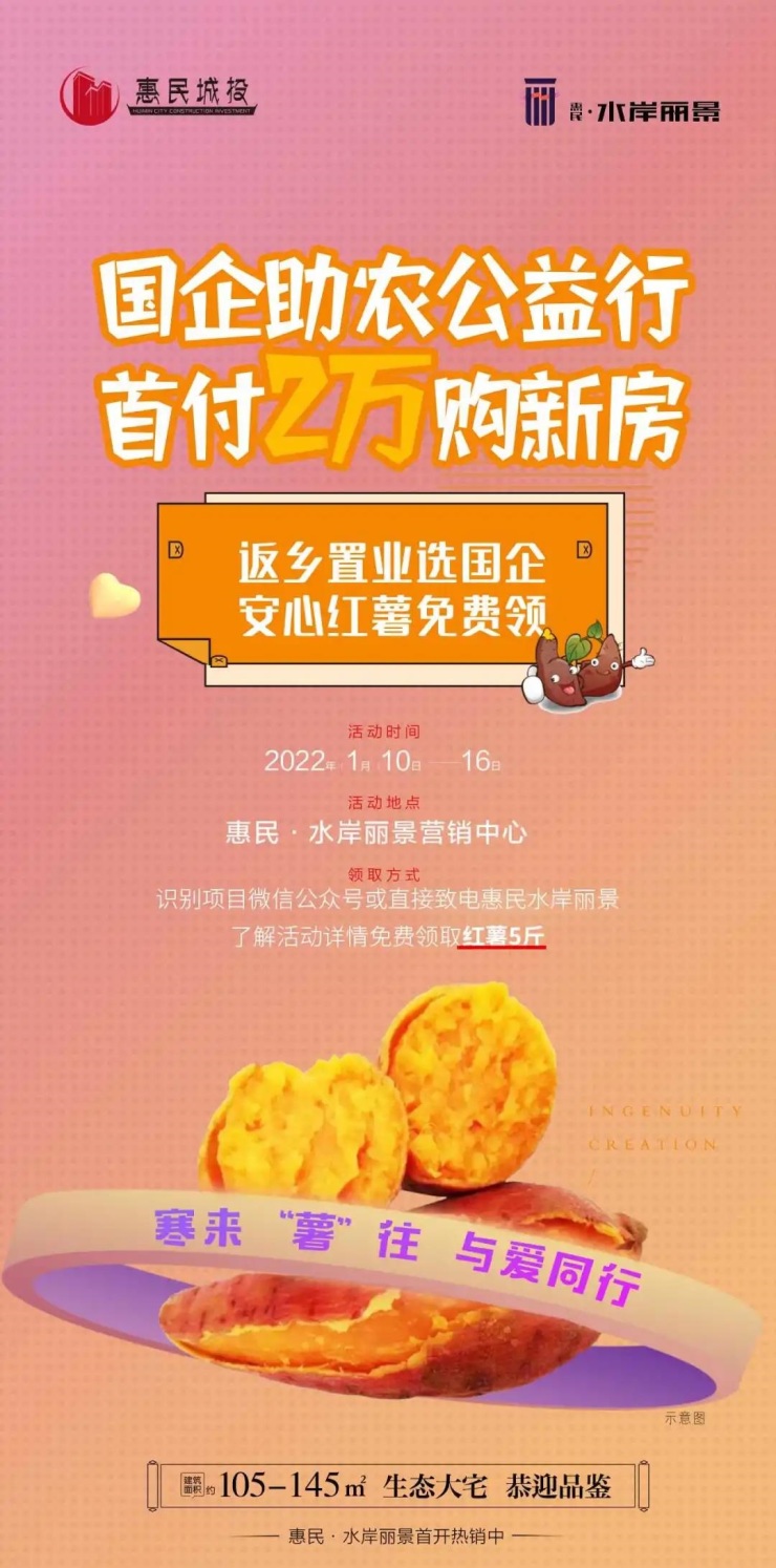 惠民·水岸丽景返乡置业选国企,惠民助力购房年。首付2万元,买房过新年!同时还有5斤爱心红薯免费领