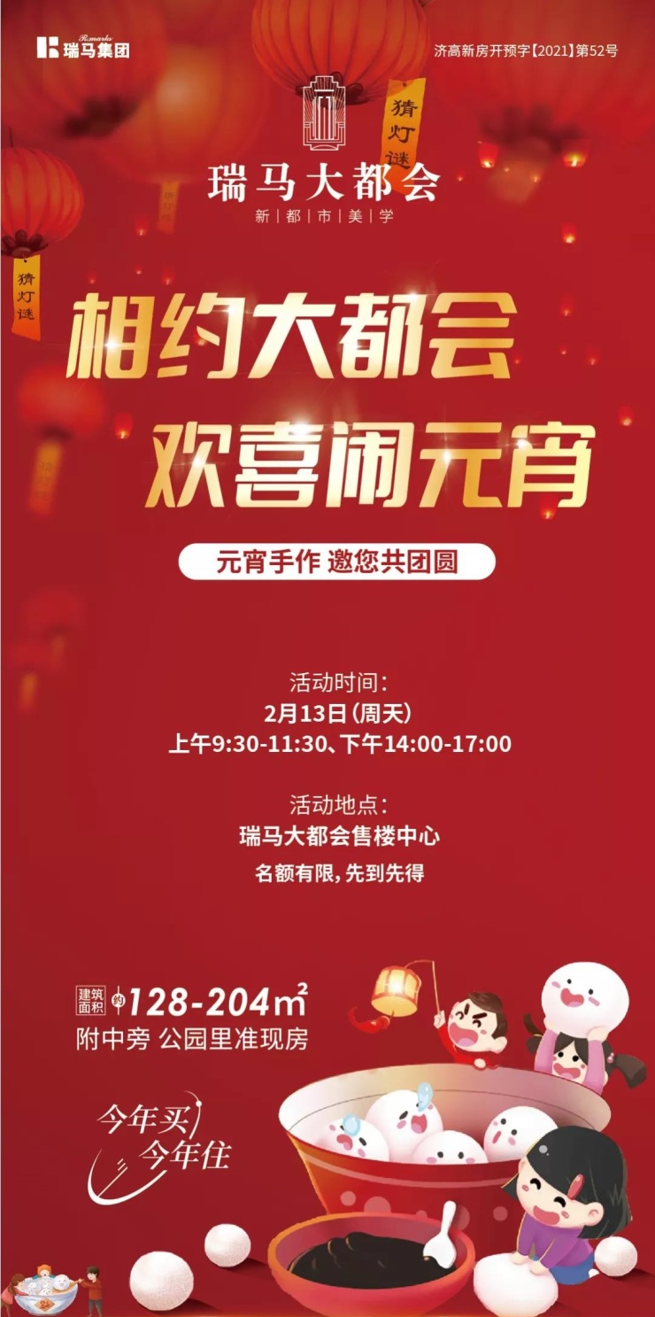 瑞马大都会售楼处将举办“相约大都会,欢喜闹元宵”手作活动,让我们欢聚一堂,一起去体验制作元宵乐趣吧!