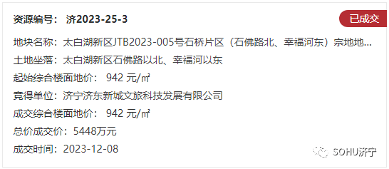 地块三:太白湖新区JTB2023-005号石桥片区(石佛路北、幸福河东)宗地地块一【济宁济东新城文旅科技发展有限公司】
