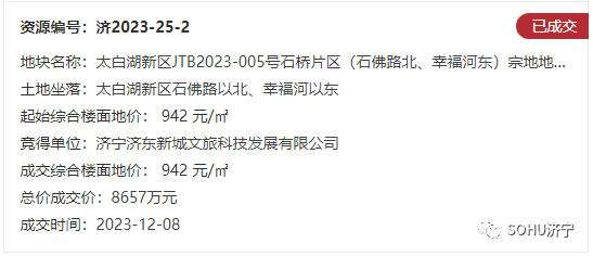 搜狐网济宁小编相关渠道获悉:经济宁市人民政府批准,济宁市自然资源和规划局决定以网上挂牌方式出让太白湖新区3宗国有建设用地使用权,土地用途为商服用地(加油站加气站用地、娱乐康体用地);总土地面积为131514㎡(约197亩);总起始价为20173万元。经竞价后,地块成交,成交价为20173万元。