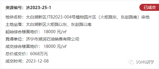 地块一:太白湖新区JTB2023-004号植物园片区(火炬路东、东赵路南)宗地【济宁市湖润石油销售有限公司竞得】