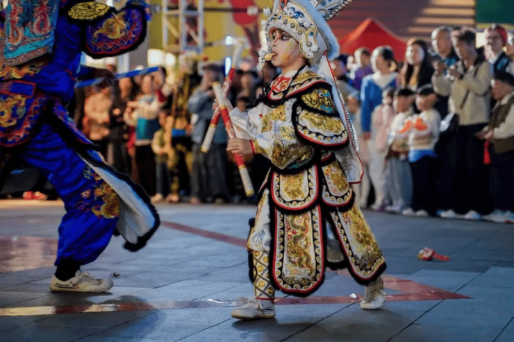“花火鲁源・回村过年” 沉浸式体验持续升温,“浮光琉璃台”上演社火大秀,中幡、英歌舞、川剧变脸、高跷社火等民俗表演循环开演,龙船游弋于灯火水面宛若星河,让游客沉浸式感受齐鲁大地浓郁年味。