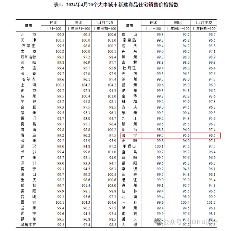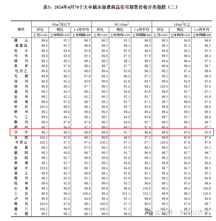 搜狐网济宁小编注意到:今早9点30分,国家统计局发布了2024年4月份70个大中城市商品住宅销售价格变动情况统计数据。2024年4月份济宁新建商品住宅销售价格环比下降0.3个百分点。