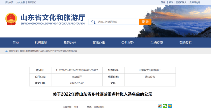为助力全面推进乡村振兴战略,提升乡村旅游发展质量和综合效益,省文化和旅游厅联合省发展改革委组织开展了2022年度全省乡村旅游重点村评选工作,经会议评审、现场暗访等环节,共有济南市历城区港沟街道芦南村等56个申报单位达到标准,现将名单予以公示,公示期自即日起至7月26日。如有异议,请在公示期内,以书面形式进行实名反映(以邮戳或邮件日期为准)。
