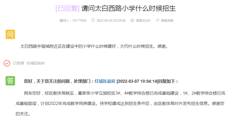 近日,搜狐网·搜狐焦点济宁小编在济宁市网络问政平台上注意到有网友提问:太白西路中海城附近正在建设中的小学什么时候建好,大约什么时候招生。感谢。