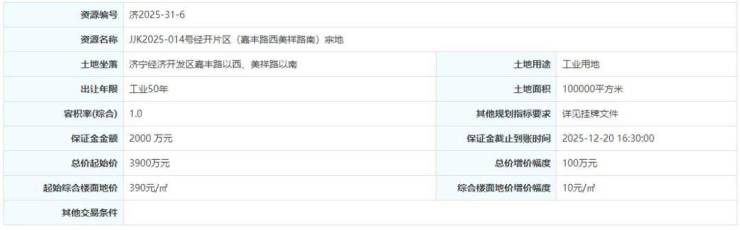 土地位于:济宁经济开发区嘉丰路以西、美祥路以南;土地面积:100000㎡(约150亩);土地用途:工业用地;出让年限:50年;容积率不小于1.0;起始价:3900万元,综合楼面价起价:390元/㎡;最终成交价为:3900万元(约26万元/亩),综合楼面地价成交价:390元/㎡;溢价率:0.0%;